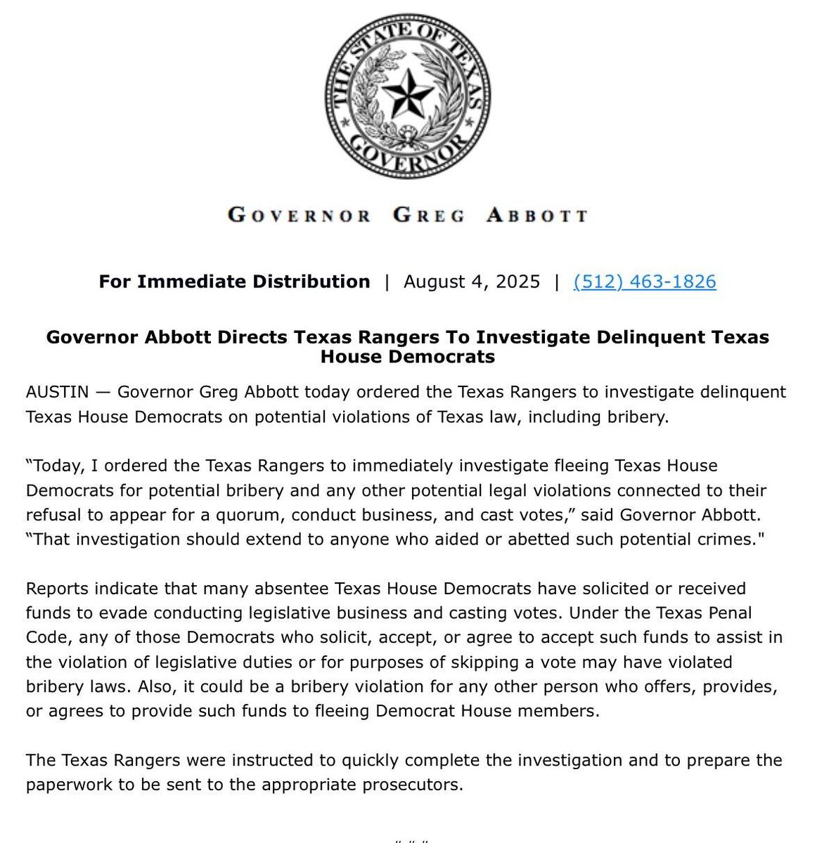 Governor of Texas orders INVESTIGATION of Democrats for felony bribery This comes after allegations that some Democrats took funds to break quorum 'The investigation should extend to anyone who aided such potential crime'