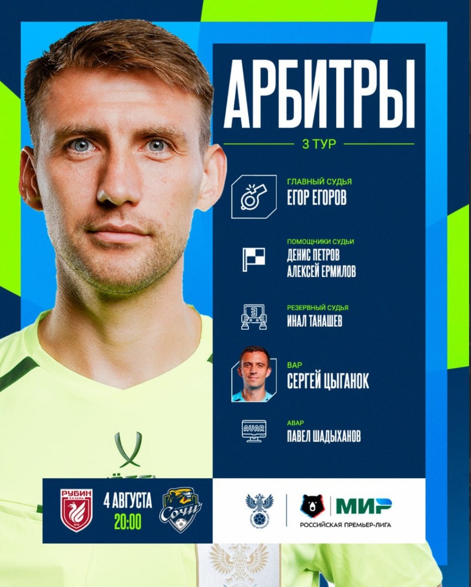 Рубин-Сочи 2-1 ❌ 9 мин. В сложной игровой ситуации ошибочно не назначает 11-м удар в ворота команды Сочи за игру рукой. Меняет решение после просмотра ВАР и назначает 11-м удар. Оценка не снижается так как данный момент даже при хорошей позиции, все детали можно рассмотреть только по видео ❌ 50 мин. Не показ ж.к игроку №8 команды Сочи (неуважение к игре) - 0,1 балл Оценка: 8,3