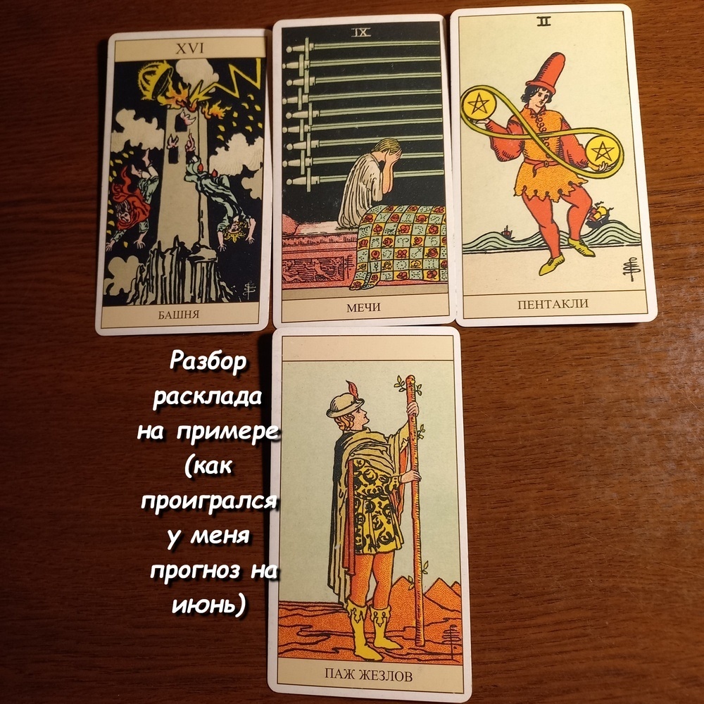 Сначала он меня напугал "страшными" картами. Проигрался в точности. Сегодня разберу, как именно. Хочу донести, что карта Башня, хотя и означает катастрофу, может проигрываться косвенно.