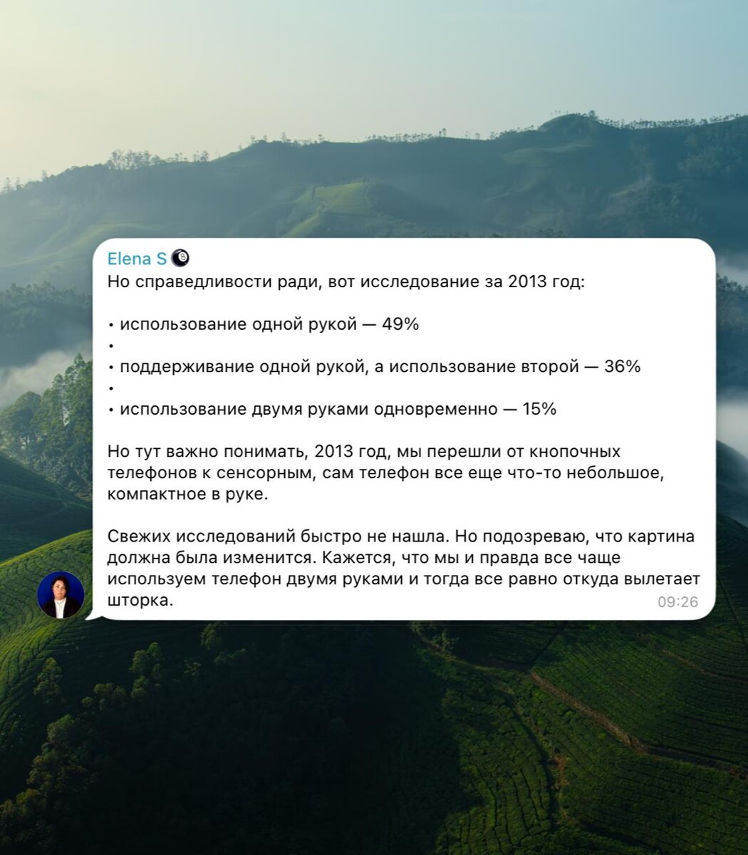 Как люди держат смартфоны Лена, спасибо тебе, что подняла эту тему в комментариях к предыдущей заметке. Это моя любимая тема по 2 причинам: - Показательна живучесть информационного мема-паразита - Упорство автора докопаться до истины Вы все знаете картинку №2 и её интерпретации. Каждый первый уважаемый дизайнер с синей галочкой в твиттере имеет красиво обрисованный вариант этой картинки. Ей завалены все поисковые выдачи. Каждый второй уважаемый собеседник апеллирует к знанию: "удобно под палец" Спасибо Steven Hoober, за твои труды! Картинка №2 взята из статьи 2013 года How Do Users Really Hold Mobile Devices? Мы не будем на ней останавливаться. Мы пойдём дальше. В 2017 год. Стивен выпускает объёмный труд состоящий из трёх частей Design for Fingers, Touch, and People, Part 1 Design for Fingers, Touch, and People, Part 2 Design for Fingers, Touch and People, Part 3 Зачем, если так удобно думать, что удобно думать "под пальцем"... ...And that’s the problem with my old columns.