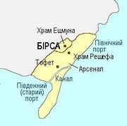 Наши знания о Бирсе, районе цитадели к северу, весьма отрывочны[85]. Склоны этого холма и крепости на нём были ареной ожесточённых боёв во время великой осады города в 146 году до нашей эры. Бирса, как сообщалось, была местом расположения храма Эшмуна (Бога исцеления), на вершине лестницы из шестидесяти ступеней[86][87]. Храм Танит (царицы-богини города), вероятно, был расположен на склоне „малой Бирсы“ непосредственно к востоку, в сторону к морю[88].