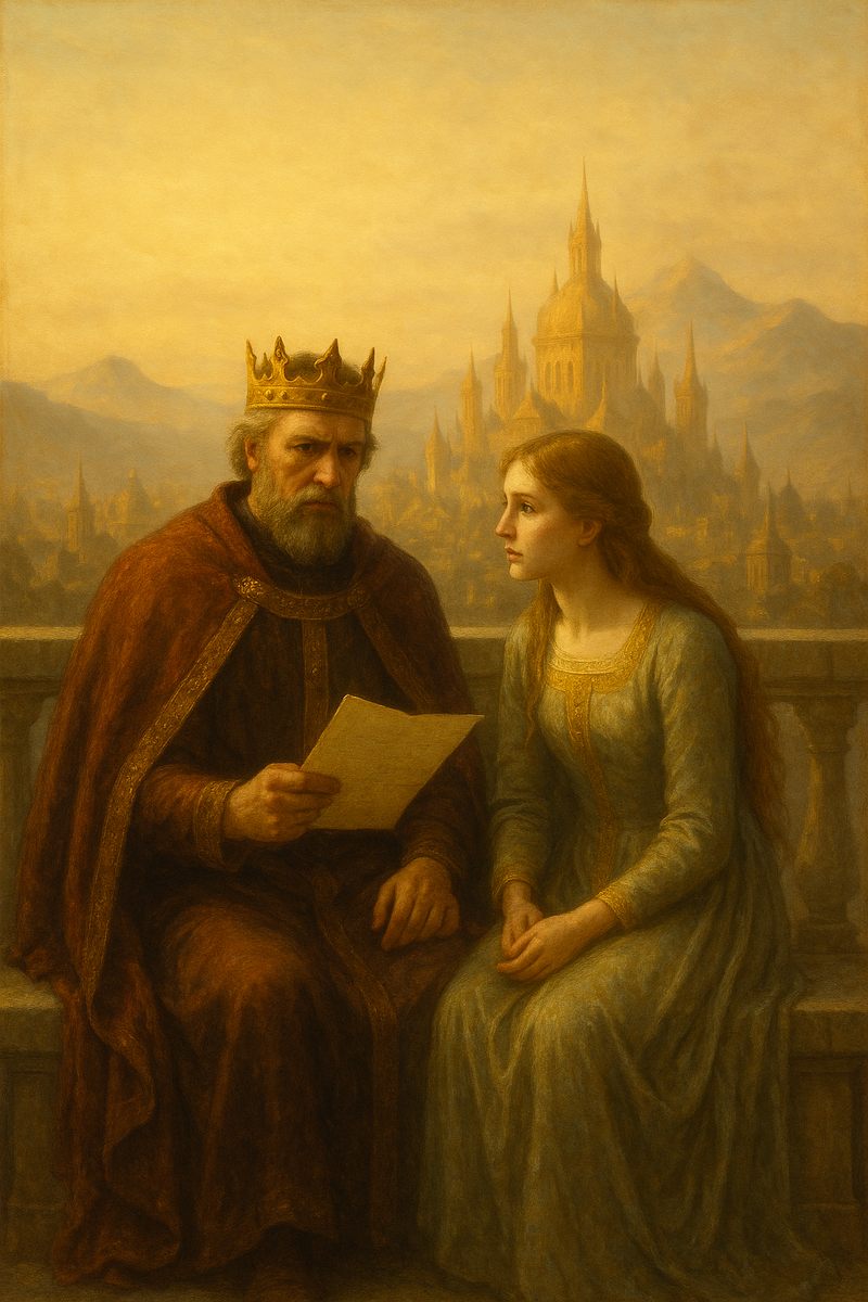 Она первой встала из-за стола и вышла из столовой. Ей не терпелось поговорить с отцом, поэтому она сразу направилась на второй этаж, в большую библиотеку, где он обычно занимался государственными делами. К её удивлению, просторная комната, залитая ярким солнечным светом, оказалась безлюдной. Створки одного из высоких окон были открыты и сильный тёплый ветер трепал прозрачную занавесь. Селея вышла на балкон. Отец сидел на каменной лавке и смотрел на город, раскинувшийся за дворцовой стеной. В руке он держал какой-то документ.