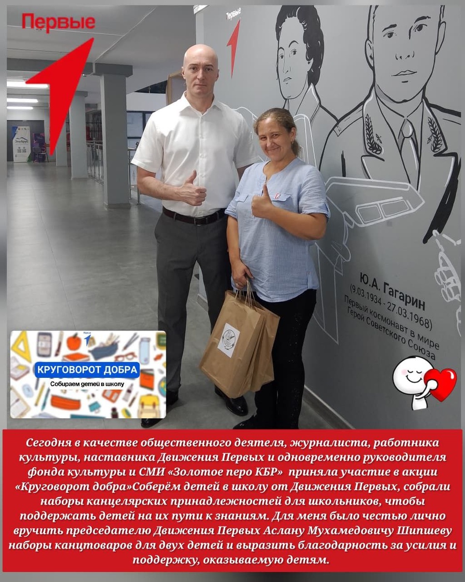 🤩🤩 Сегодня в качестве общественного деятеля, журналиста, работника культуры, наставника Движения Первых и одновременно руководителя фонда культуры и СМИ «Золотое перо КБР» приняла участие в акции «Круговорот добра» от Движения Первых, собрали наборы канцелярских принадлежностей для школьников, чтобы поддержать детей на их пути к знаниям.