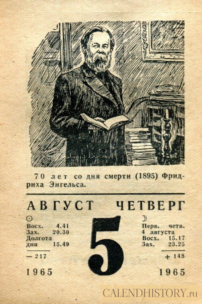 Итак, сегодня 5-го августа и у нас на календаре 1965-й год. Перед нами листок советского календаря для женщин. На календаре у нас четверг - 5 августа 1965-го года. 70 лет со дня смерти (1895) Фридриха Энгельса. *** Оборотную сторону листка этого календаря можно посмотреть у нас по ссылке на сайте. Заходите на наш интересный сайт об отрывных календарях. Другие листки советских календарей смотрите у нас на сайте - CALENDHISTORY.ru ПОСМОТРИТЕ ЕЩЁ ЛИСТКИ ОТРЫВНЫХ КАЛЕНДАРЕЙ: