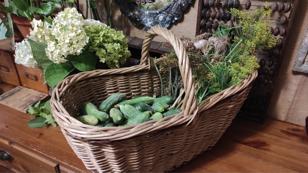 Привезла корзинку разных огородных даров, вот сейчас их черёд и настал. К сожалению, на две трехлитровые банки у меня огурцов не хватило, сделаю одну солёных, а себе небольшую баночку экспериментальных маринованных.