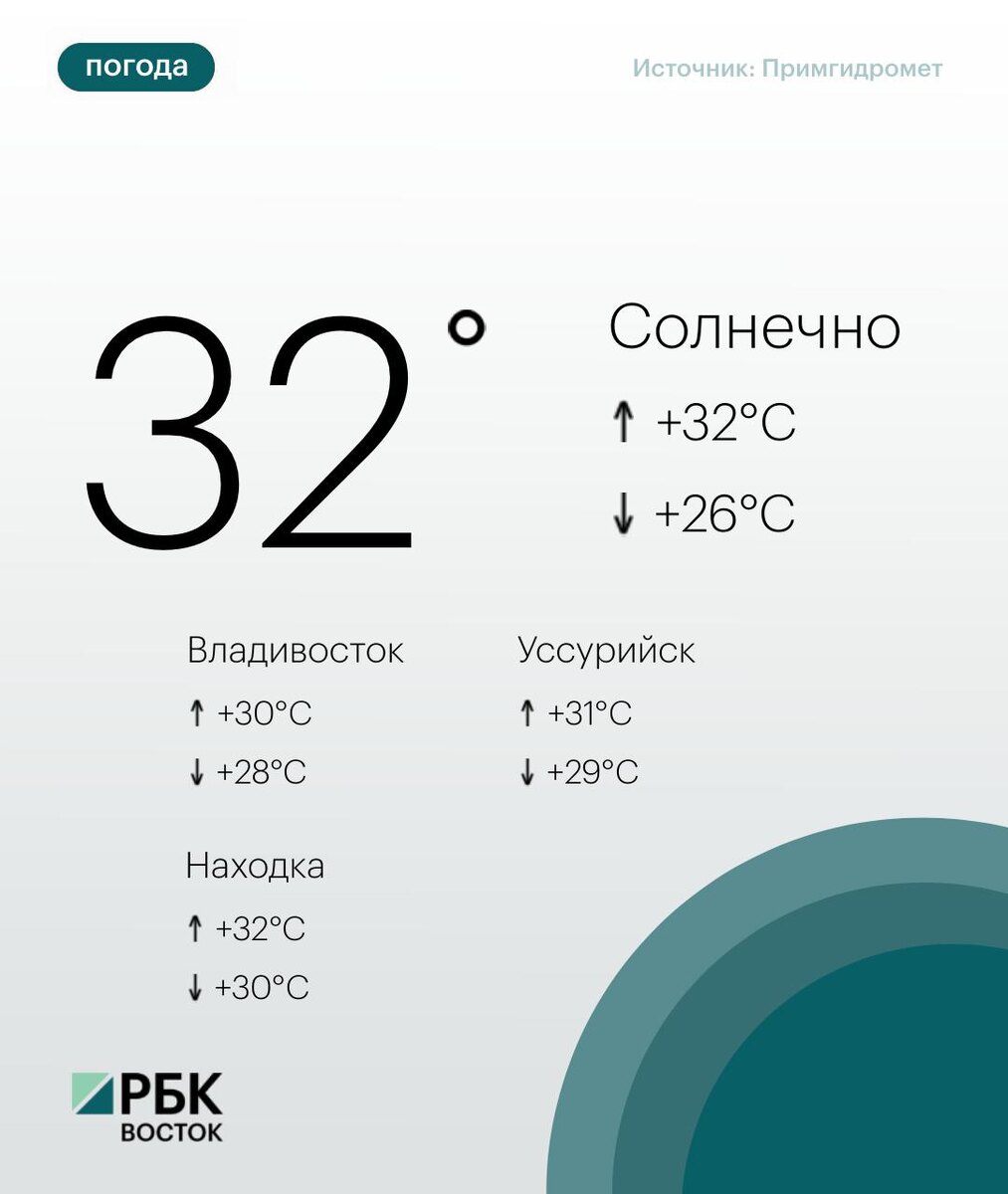 Сегодня погоду в Приморье определяет поле повышенного атмосферного давления, в конце дня фронтальные разделы. В конце дня на юго-западе небольшой дождь. Утром в отдельных районах туман. Ветер слабый до умеренного. Температура воздуха +26...+32°C ☀️ Во Владивостоке небольшая облачность, в конце дня возможен небольшой дождь. Ветер слабый до умеренного. Температура воздуха +28...+30°C. 😃Подписывайтесь на РБК Восток