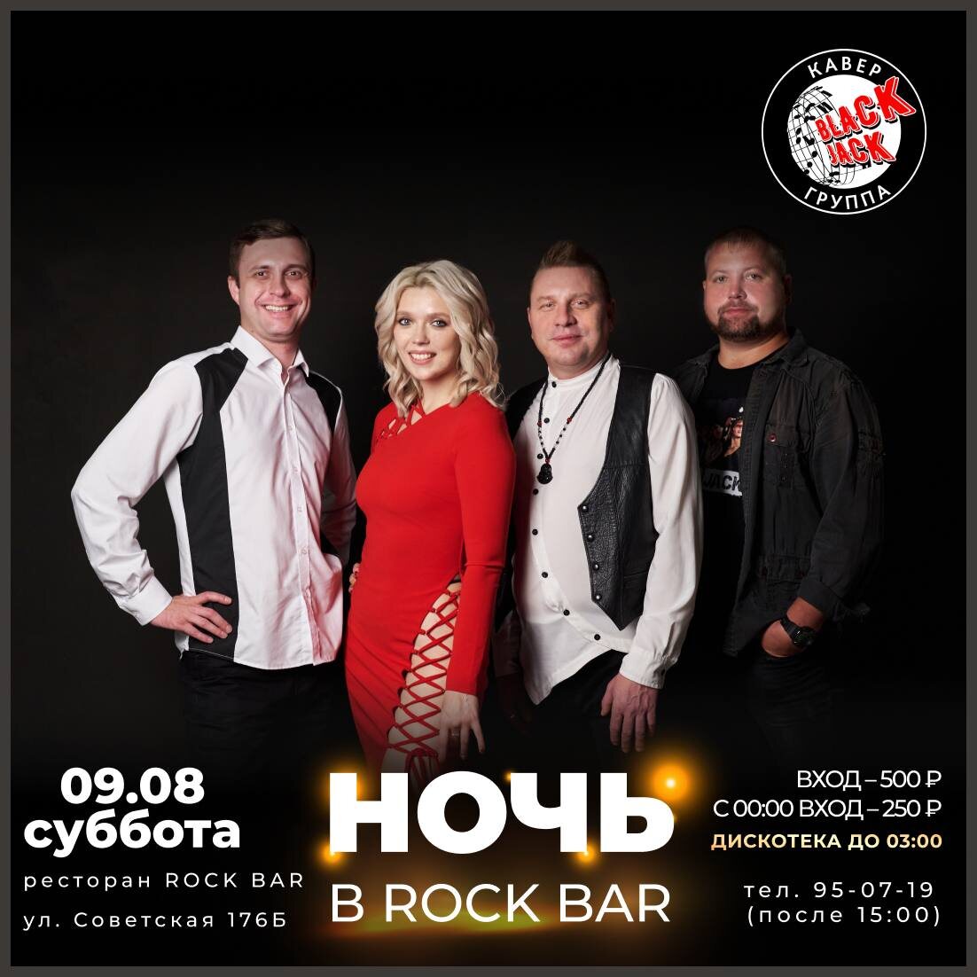 9 АВГУСТА СБ. ”НОЧЬ В ROCK BAR” 21:30- 03:00 ГРУППА BLACK JACK & ДИСКОТЕКА Классная летняя суббота - зажигательная танцевальная программа от группы BLACK JACK , а в продолжении концерта - дискотека. Любимые песни всех стилей и времён весь вечер и всю ночь. Вход 500₽, с 00:00 - 250₽ ✅ Уважаемые гости! Пожалуйста, если Вы опаздываете, позвоните или напишите нам, при опоздании более 15 минут без предупреждения бронь может сниматься. АС 18+ FC/DC Данная публикация носит исключительно информационный характер. 📞INFO/RV (с 15:00) +7-9148-95-07-19 💻 INFO/RV: www.rockbar38.ru 📍г.Иркутск, ул. Советская 176Б