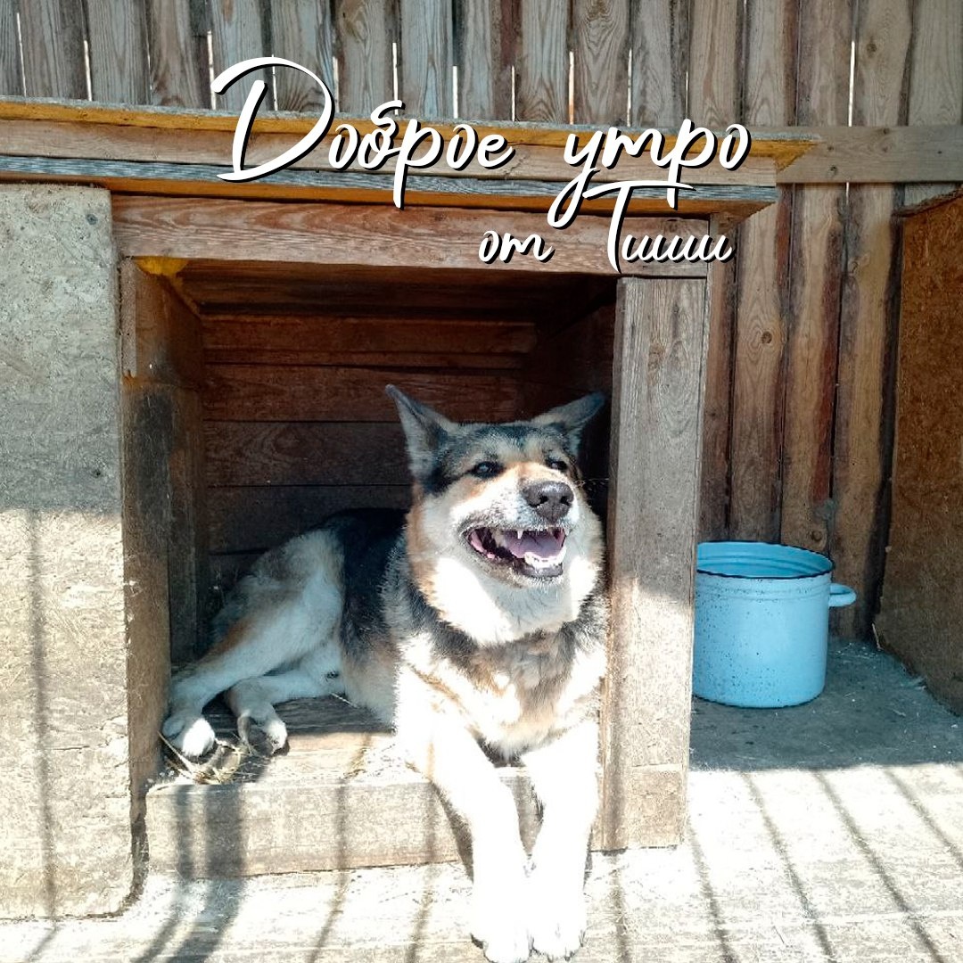 Доброе утро от Тиши. Он любит встречать первые солнечные лучи, лёжа у своей будки. Никуда не спешить, просто смотреть на мир и ловить тепло. В приюте утро всегда шумное, но для Тиши эти минуты — маленький островок тишины. Пусть и ваш день начнётся с такого же спокойствия.