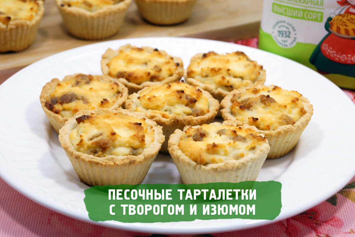 Песочные тарталетки с творогом и изюмом Песочные тарталетки с творогом и изюмом – это миниатюрные шедевры, которые покорят вас своей нежностью и гармоничным вкусом. Хрустящая рассыпчатая основа из песочного теста с маслянистыми нотками идеально сочетается с творожной начинкой, а сладкий изюм добавляет приятные медовые акценты. Время приготовления: 50 минут. Ингредиенты: 250 г муки ТМ «Алейка», 200 г творога, 150 г сахара, 100 г сливочного масла, 50 г изюма, 2 яйца, 4 ст. Ложки крахмала, 1/4 ч. ложки разрыхлителя, 1 щепотка соли. Приготовление: Приятного аппетита!