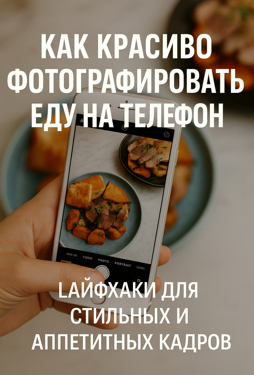Лайфхаки для стильных и аппетитных кадров Ты когда-нибудь готовила что-то вкусное, а когда решила сфоткать — получилось как-то... ну, не очень? Вот чтобы еда на фото выглядела так же вкусно, как в жизни, — собрала простые советы, которые помогут тебе делать стильные и аппетитные снимки на обычный телефон. Лучше всего снимать у окна, когда свет мягкий — утром или ближе к закату. Избегай прямых солнечных лучей и жёлтого света ламп — еда под таким светом выглядит "устало". Если свет слишком жёсткий — повесь на окно белую тюль или простыню, и получишь мягкое, рассеянное освещение. Совет: снимай со стороны окна, а не спиной к нему — так свет красиво подсветит текстуру блюда. 2. Ищи удачный ракурс Важно: следи, чтобы стол был аккуратный. Мелкий хаос — ок, но не грязная вилка в углу. 3. Добавь настроение в кадр Хорошая еда — это всегда история. Положи рядом салфетку, книгу, чашку кофе, руку с вилкой, цветы. Сделай кадр "живым", не слишком постановочным. Будто ты приглашаешь зрителя сесть