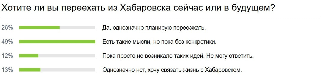 26% точно уверены в своем ответе: однозначно собираются уехать. 13% хотят остаться и связать свою жизнь с Хабаровском. Оставшиеся 12% не уверены в своем ответе, однако таких мыслей у них пока не возникало.