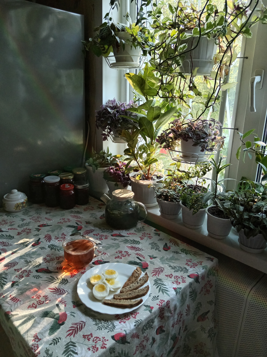 Солнце пронизывает пространство сквозь мои любимые цветы. Ложится полосами на стол, подсвечивая крепкий свежезаваренный чай.