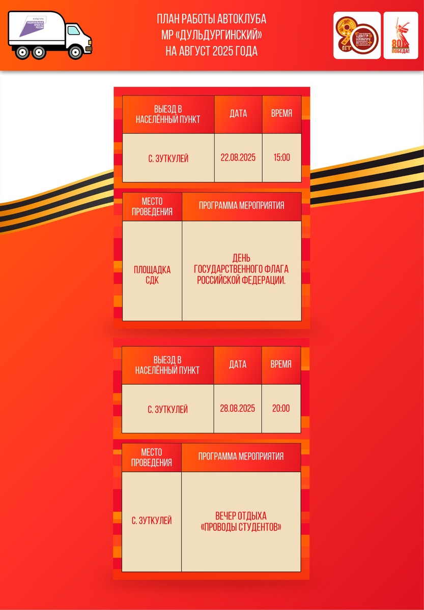 🇷🇺 В 2025 году гайд "Дорогами культуры" включит в себя патриотические программы, посвященные празднованию 80-летнего юбилея Победы в Великой Отечественной войне. 🚐 Куда поедет в августе автоклуб Дульдургинского района, смотрите афишу.