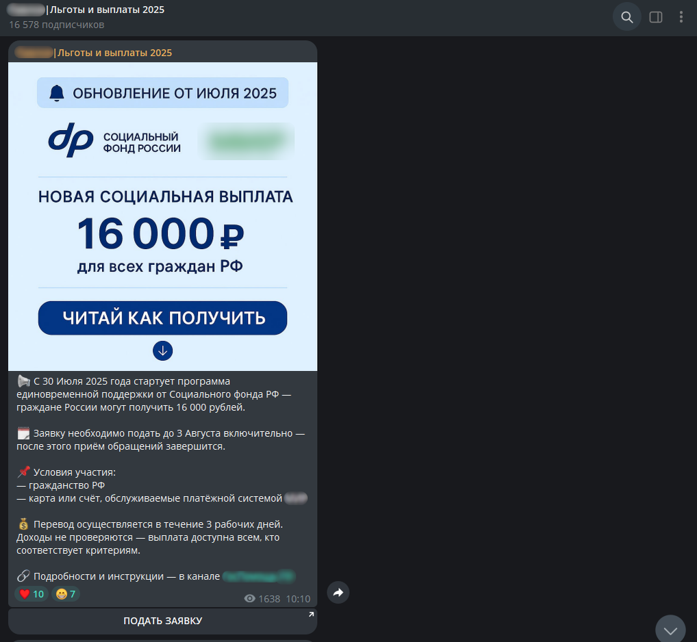 Компания F6, ведущий разработчик технологий для борьбы с киберпреступностью, зафиксировала новую волну инвестскама с приманкой в виде фейковых новостей о выплатах молодым семьям и детских пособий, а также помощи с погашением ипотеки. Фейки маскируют в том числе под новости ведущих российских СМИ и распространяют через Telegram-каналы социальной тематики. Вся схема обмана с дальнейшим хищением денег и персональных данных происходит исключительно в мессенджере, без использования сторонних ресурсов. В преддверии нового учебного года аналитики департамента защиты от цифровых рисков (Digital Risk Protection) компании F6 обнаружили очередную массовую атаку мошенников на жителей России с использованием фейков. В ряде Telegram-каналах, в названиях которых присутствуют слова «пособия», «выплаты», «льготы», среди достоверной информации о мерах социальной поддержки жителей России активно распространяют фейковые сообщения. Число подписчиков таких каналов составляет десятки тысяч человек, а некотор