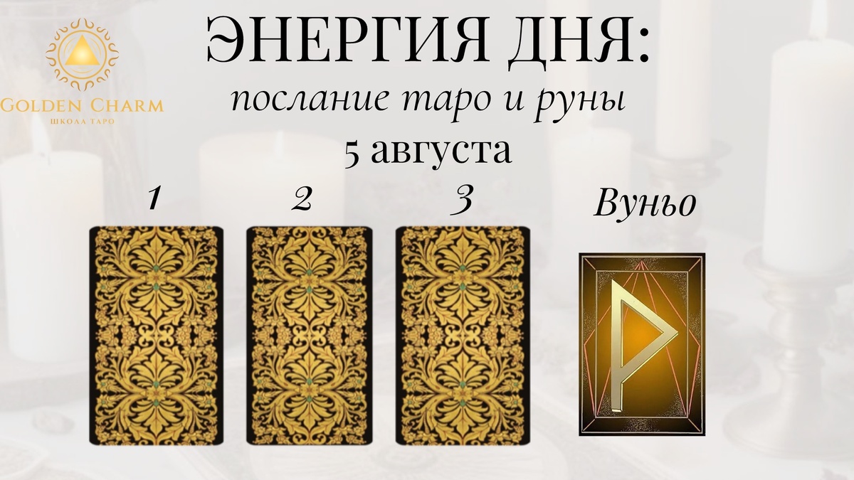 Заказать личный расклад тут✅ Прогноз на 5 августа : что тебя ждёт Приходи на обучение Таро ✅ Выбери карту — 1, 2 или 3 — и узнай, какой путь для тебя: 1. Рыцарь Пентаклей Это день стабильности и упорства. Ты сможешь завершить начатые проекты, добиться конкретных результатов. Старайся действовать методично и последовательно. 2. Рыцарь Жезлов Время для активных действий и смелых решений. Тебе предстоит принять важное решение или начать новое дело. Действуй решительно и уверенно. 3. Императрица Наступил период творчества и вдохновения. Возможно, у тебя появятся новые идеи или возможности для самовыражения. Позволь себе творчески раскрыться. Руна дня — Вуньо Символ радости, успеха и гармонии. Сегодня благоприятный день для общения, встреч с друзьями и близкими. Наслаждайся моментом и общением. Напиши цифру карты + ВУНЬО в комментариях, чтобы активировать энергию. Хочешь личный расклад? Пиши — посмотрим, что ждёт тебя: Заказать личный расклад тут✅ Обучение Таро и Рун