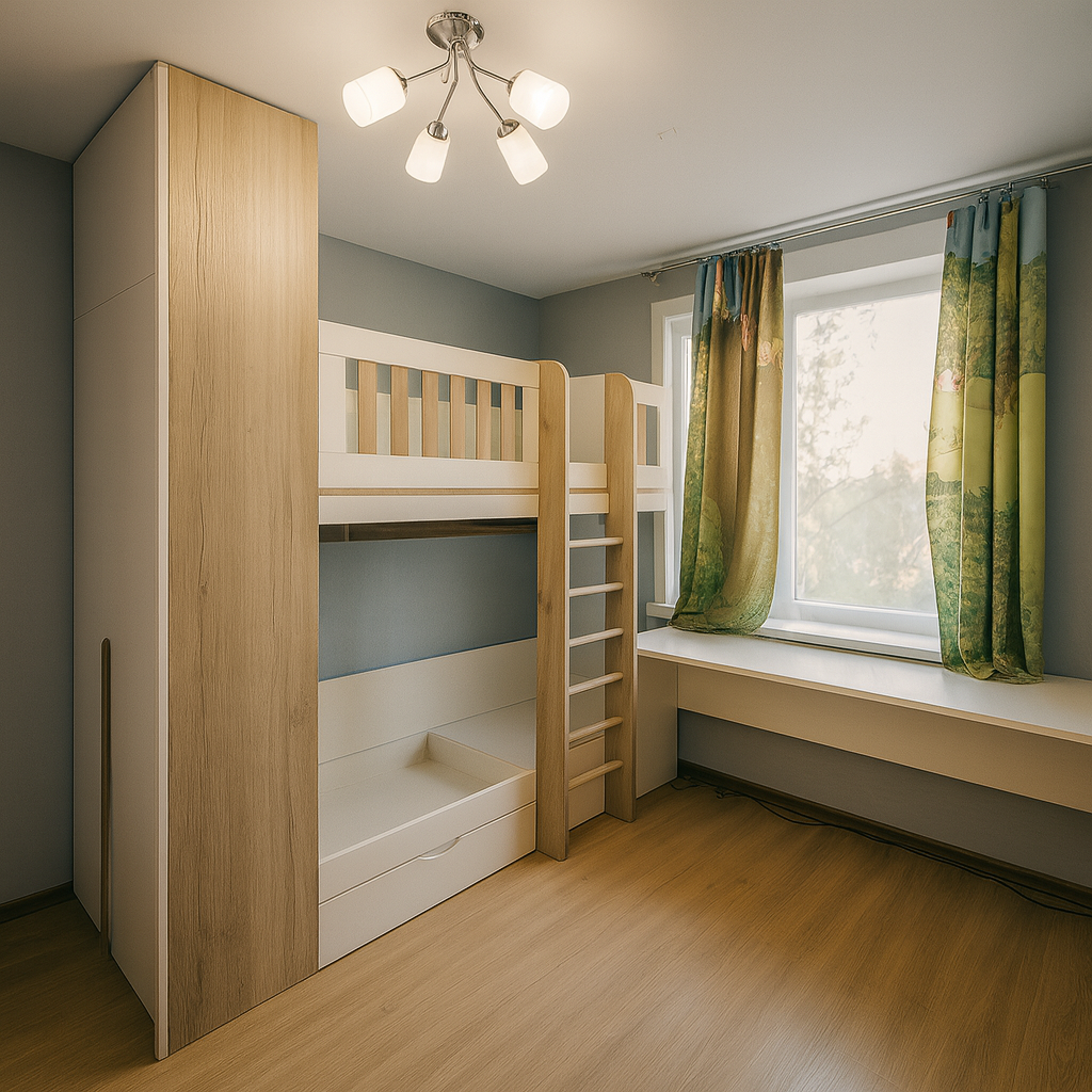Обустроить одну комнату для троих разнополых детей — кажется невыполнимой задачей. Когда у детей разный возраст — но у каждого есть своё пространство. Три ребёнка (12, 10 и 5 лет), одна комната и запрос на уют, порядок и личные уголки. Нужны отдельные места для сна, учёбы и игры — чтобы всё уживалось в одном пространстве и «росло» вместе с детьми. Решение по зонам: Для младшей сесрички (5 лет): Для младшей — розово-белая зона с кроватью-чердаком. Наверху — мягкое и уютное спальное место, внизу — светлый стол, ящики, полки. Здесь она может рисовать, играть, учиться — всё под рукой, всё своё. Для старших братьев (10 и 12 лет): Двухъярусная кровать со встроенным шкафом и продуманной системой хранения. Минимум лишнего — максимум свободы и порядка. Общее пространство:
