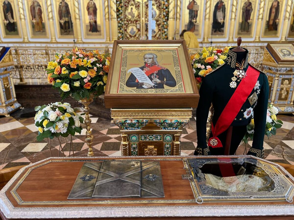 Святый праведный воин Феодоре, моли Бога о стране нашей Российской и о нас недостойных сынах ея! О, пресла́вный и достохва́льный во́ине, флотово́дче Фео́доре, небе́сный на́ш заступниче и кре́пкий защи́тниче! Днесь, па́мять твою́ почита́юще, смире́нно мо́лим тя: вознеси́ о нас ко Го́споду Бо́гу те́плыя твоя́ моли́твы и испроси́ у Него́ оставле́ние все́х согреше́ний на́ших, имиже преогорчева́ем Его́. Умоли́ Го́спода дарова́ти нам ко Оте́честву на́шему любо́вь нелицеме́рную, мир и благоде́нствие Це́ркви на́шей Правосла́вней, всем же нам теле́сное здра́вие и душе́вное спасе́ние, христиа́нскую кончи́ну живота́ на́шего и до́брый отве́т на Стра́шнем Суде́ Его́. Ей, свя́тче Бо́жий, не посрами́ упова́ния на́шего, е́же на тя́ по Бо́зе и Богоро́дице возлага́ем, да, твои́ми моли́твами получи́вше благода́ть и ми́лость от Го́спода, просла́вим человеколю́бие Отца́ и Сы́на и Свята́го Ду́ха, и твое́ свято́е засту́пле́ние, ны́не и при́сно, и во ве́ки веко́в. Ами́нь. С праздником, дорогие братья и сест