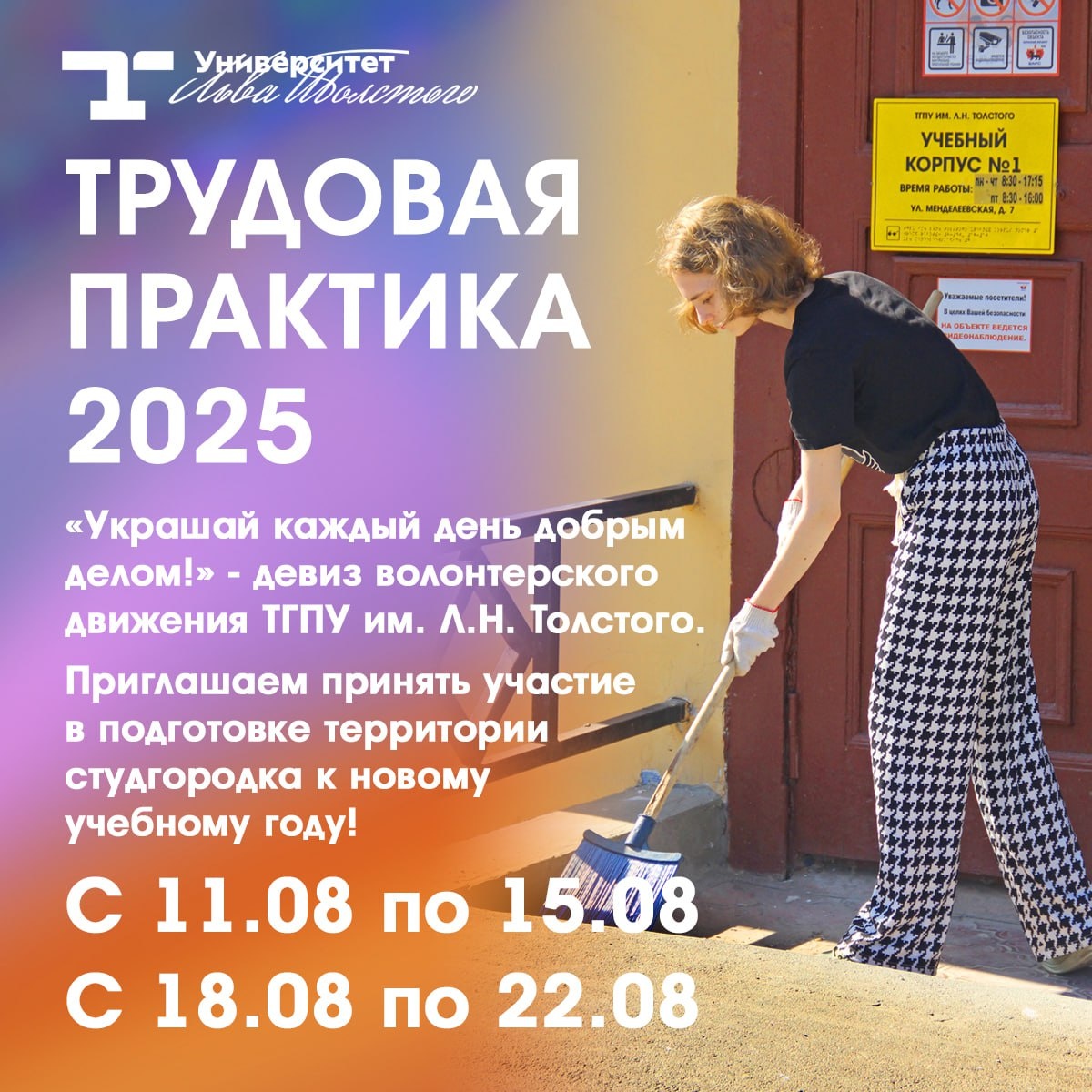 Внимание, первокурсники! Приглашаем принять участие в подготовке студгородка к новому учебному году ✌️ Традиционно студенты-первокурсники оказывают помощь в приведении в порядок учебных аудиторий, корпусов общежитий и территории кампуса к занятиям. Добровольная трудовая практика позволит ближе познакомиться с вузом и будущими сокурсниками 🤝 Волонтерская деятельность в августе организована в два этапа: ✔️с 11 по 15 августа; ✔️с 18 по 22 августа. Инструктаж по технике безопасности проводится 11 и 18 августа в 09.00 в Точке кипения (учебного корпуса №4, 2 этаж). Каждый может самостоятельно определить сроки участия в волонтерской деятельности. Для этого необходимо: Зарегистрироваться: https://vk.cc/cOjnSp Заполнить заявление: https://vk.cc/cOjnZq Заполнить согласие родителей (для несовершеннолетних): https://vk.cc/cOjo7c #УниверситетЛьваТолстого
