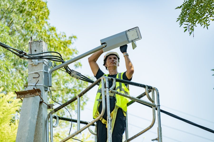 Горсвет монтирует новые светильники вдоль дороги от улицы Академика Крылова до улицы Рябова