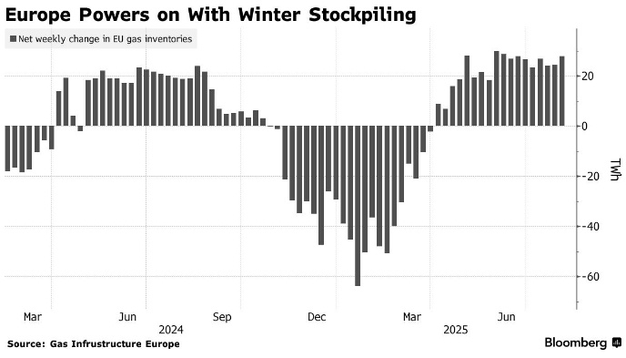 Цены на европейский газ застряли в пятинедельном диапазоне по мере накопления запасов Цены на природный газ в Европе продолжают оставаться в узком диапазоне, в котором они находятся уже около пяти недель. Это связано с тем, что регион активно накапливает запасы топлива на предстоящую зиму. Фьючерсы на эталонные электростанции колебались около отметки €34 за мегаватт-час после небольшого роста на предыдущей сессии. С конца июня контракты в основном торговались в диапазоне €32–35 за мегаватт-час. В июле наблюдался самый узкий месячный диапазон в этом году. Европа активно готовится к зиме и стремится создать достаточные запасы газа. Последние данные Gas Infrastructure Europe показывают, что закачка газа в хранилища на прошлой неделе выросла больше всего с июня. Это помогает сдерживать цены, несмотря на то, что президент США Дональд Трамп усилил угрозу санкций против Индии за покупку российской нефти. Это усилило опасения по поводу приближающегося крайнего срока 8 августа, к которому Москв