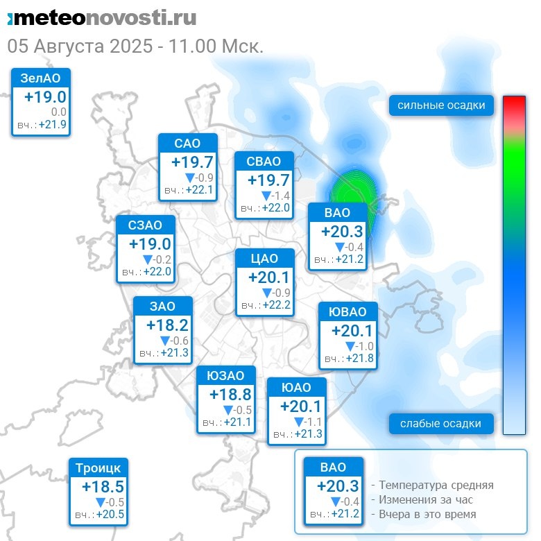 В 11:00 в Москве было от +17.4°C до +21.2°C, средняя температура +19.5°C #погода #Москва #лето #температура #5августа #вторник