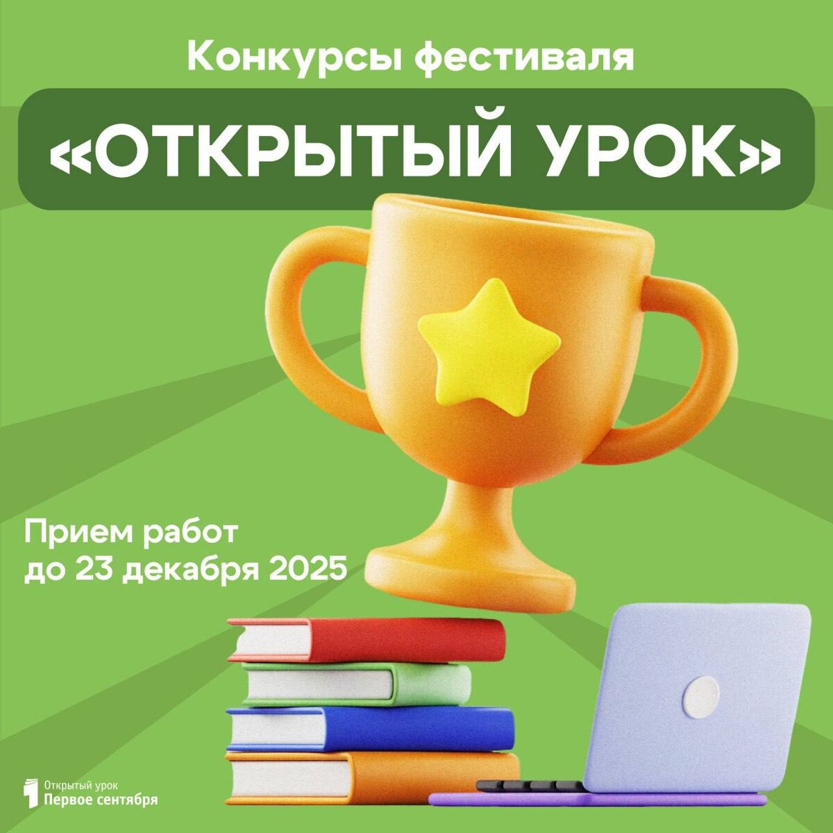 🎉 Издательский Дом «Первое сентября» приглашает вас принять участие в конкурсах второго полугодия 2025 года на Всероссийском фестивале «Открытый урок» – urok.1sept.ru 📆 Материалы на конкурс принимаются до 23 декабря 2025 года Конкурсы 2025: 1️⃣ Конкурс "Презентация к уроку" 2️⃣ Конкурс "Презентация к уроку с применением искусственного интеллекта" 3️⃣ Конкурс "Великая Отечественная война: взгляд сквозь время" 4️⃣ Конкурс "Викторина как элемент проверки полученных знаний" 5️⃣ Конкурс "Выпускной праздник в детском саду" 6️⃣ Конкурс "Как это делаю я: приёмы преподавания сложных тем учебной программы" 7️⃣ Конкурс "У нас в школе есть музей" 8️⃣ Конкурс "Что можно сделать из обычного мусора" Каждый участник получает: 🔹 персональный диплом об участии в фестивале; 🔹 сертификат, подтверждающий факт публикации материалов; 🔹 сборники тезисов всех присланных статей (в электронном виде за доп. плату). Желаем интересной продуктивной работы и ждём Ваши материалы на фестивале! 📞 По всем воп