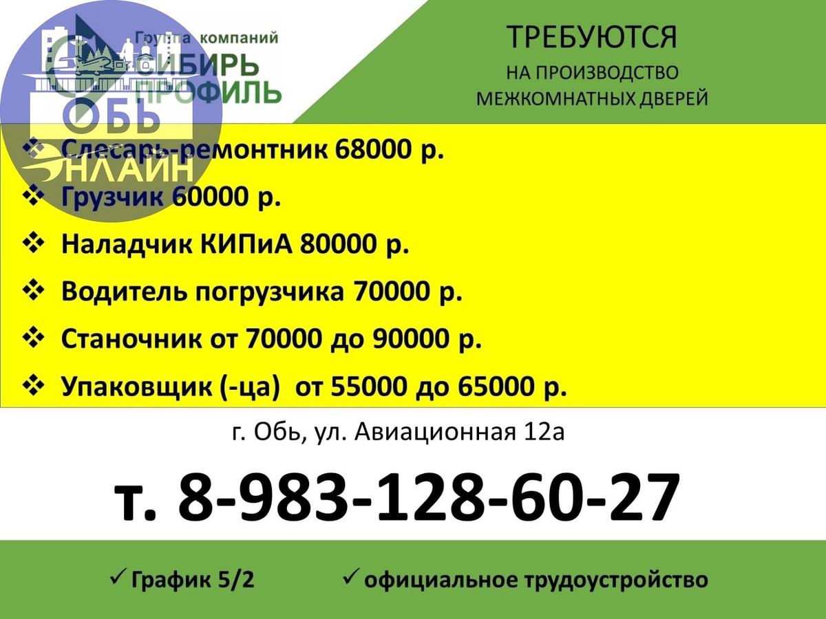 ↗ На производство МЕЖКОМНАТНЫХ дверей требуются: ✅Упаковщик (-ца) 55-65тр. ✅Станочник 70-90 тр. ✅Слесарь 68тр. ✅Наладчик КИПиА 80тр. ✅Водитель погрузчика 70тр. ✅Грузчик 60тр. г. Обь, Авиационная 12а. Звоните в отдел персонала по т. 8-983-128-60-27. #Reklama@ob.gorod vk.com Подробнее на https://vk.com/ob.gorod #городобь #городобьонлайн #толмачево
