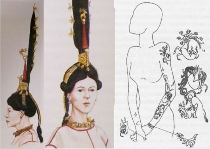 Мумия женщины найденная в Сибири на плато Укок в 1993 г. имеет татуировки. Ноги козла расположены похоже на хвост Козерога. Так делают крошна = "козу" - носилки каменщика: доска на спину, верхние ножки на плечи, на нижние ножки кладут кирпичи. (В.Даль "Коза – крошна, заплечные носилки каменщика: доска с парами ножек в разные стороны (одна пара на плечи, на другую ноша кирпичей)".) Название коза-крошна родственно кОзлы-подставка. Созвездие Возничий несёт на спине Козочку-Капеллу. Т.е. Возничий это каменщик с "козой", где "козлята" это камни. В общем, получается древнее "масонство". Если творец - Архитектон, то Возничий - творец возникания. Масонов винят в "захвате власти". Капелла родственно лат. Capio, cepi, captum взять, брать, получать, стяжать, влечь, усвоить, глотать, хватать, завладеть, завоевать, отнять, отторгать, ловить, поймать, пленять, восхищать, чаровать, вмещать, терпеть, нести, держать. Capitatio поголовное обложение, подушная подать. Т.е. масонство - державники. Властн