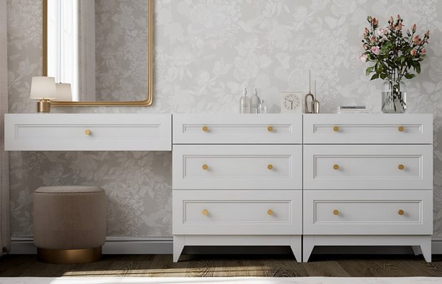 Этот комод станет центральным элементом интерьера, органично вписываясь как в спальни, так и в гостиные. Вместительные ящики помогут организовать хранение вещей, освобождая пространство и создавая атмосферу уюта. Белый оттенок привнесет легкость и свежесть, визуально расширяя пространство. В дополнение можно подобрать другие предметы из линейки.