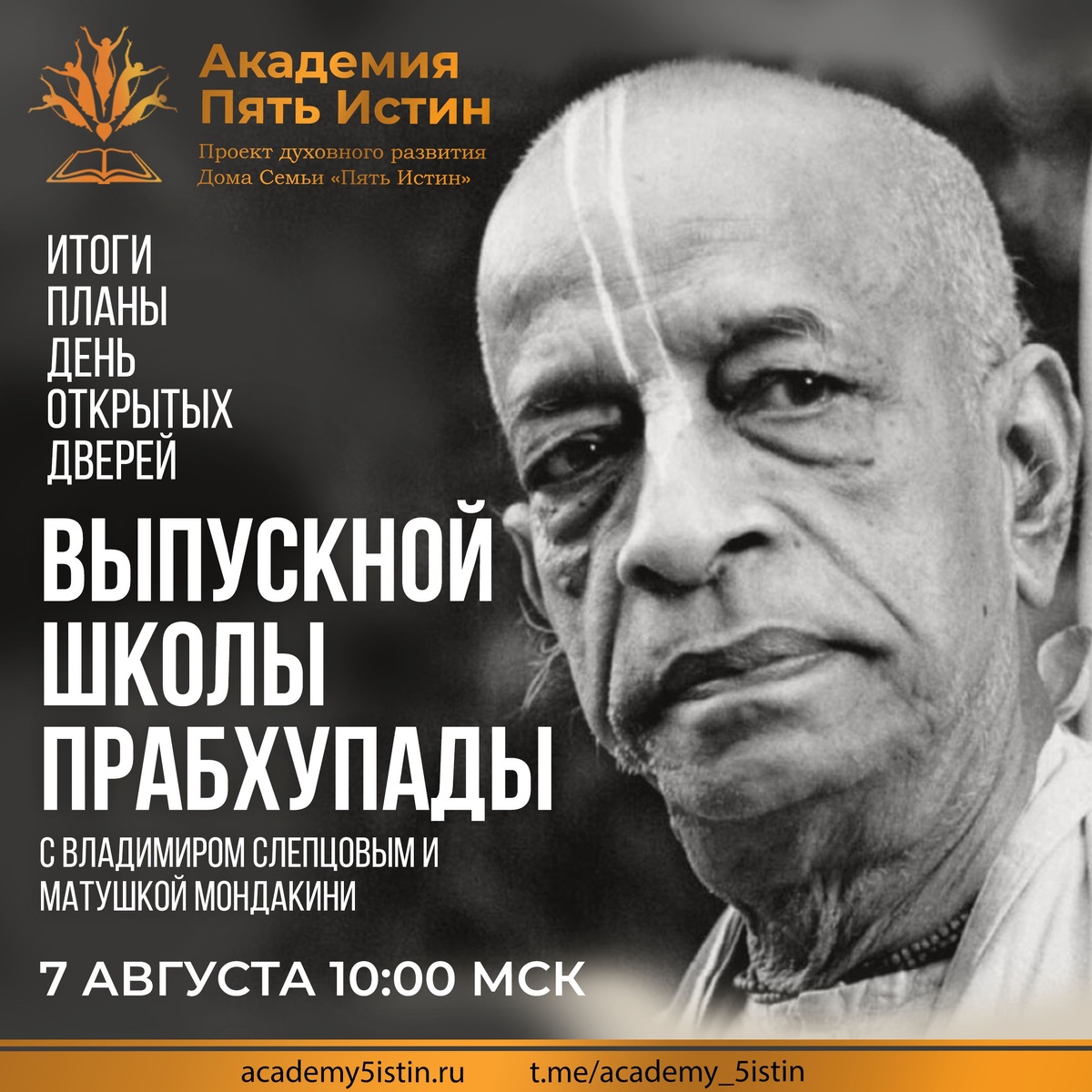 📣Дорогие друзья! ⭐️❓⭐️Что объединяет людей из разных уголков мира и помогает оставаться на плаву даже в самых бурных волнах жизни? ⭐️❓⭐️ Ответ вы узнаете на нашем 🎉ВЫПУСКНОМ ШКОЛЫ ПРАБХУПАДЫ!🎉 Вас ждут вдохновляющие истории, неожиданные признания и атмосфера настоящей дружбы. Встреча пройдёт с Владимиром Слепцовым (Вальмики дас), ученицей Шрилы Прабхупады Матушкой Мондакини, студентами школы и кураторами. Как говорит Владимир Слепцов: «Книги Шрилы Прабхупады — это спасательный круг в океане материального существования». Готовы узнать, какие тайны хранят страницы этих книг? 📣 Ждём вас 7 августа в 10:00 (МСК) Встреча пройдёт в Zoom (ссылка появится за 5 минут до начала на канале Академии "Пять Истин" — https://t.me/academy_5istin Также смотрите прямой эфир: • ВКонтакте: https://vk.com/academy5istin • YouTube: https://www.youtube.com/c/АкадемияПятиИстин Откройте для себя нечто большее вместе с нами! ___________ ⭐️ РЕГИСТРАЦИЯ В ШКОЛУ: ⤵️⤵️⤵️ www.academy5istin.ru/prabhupad