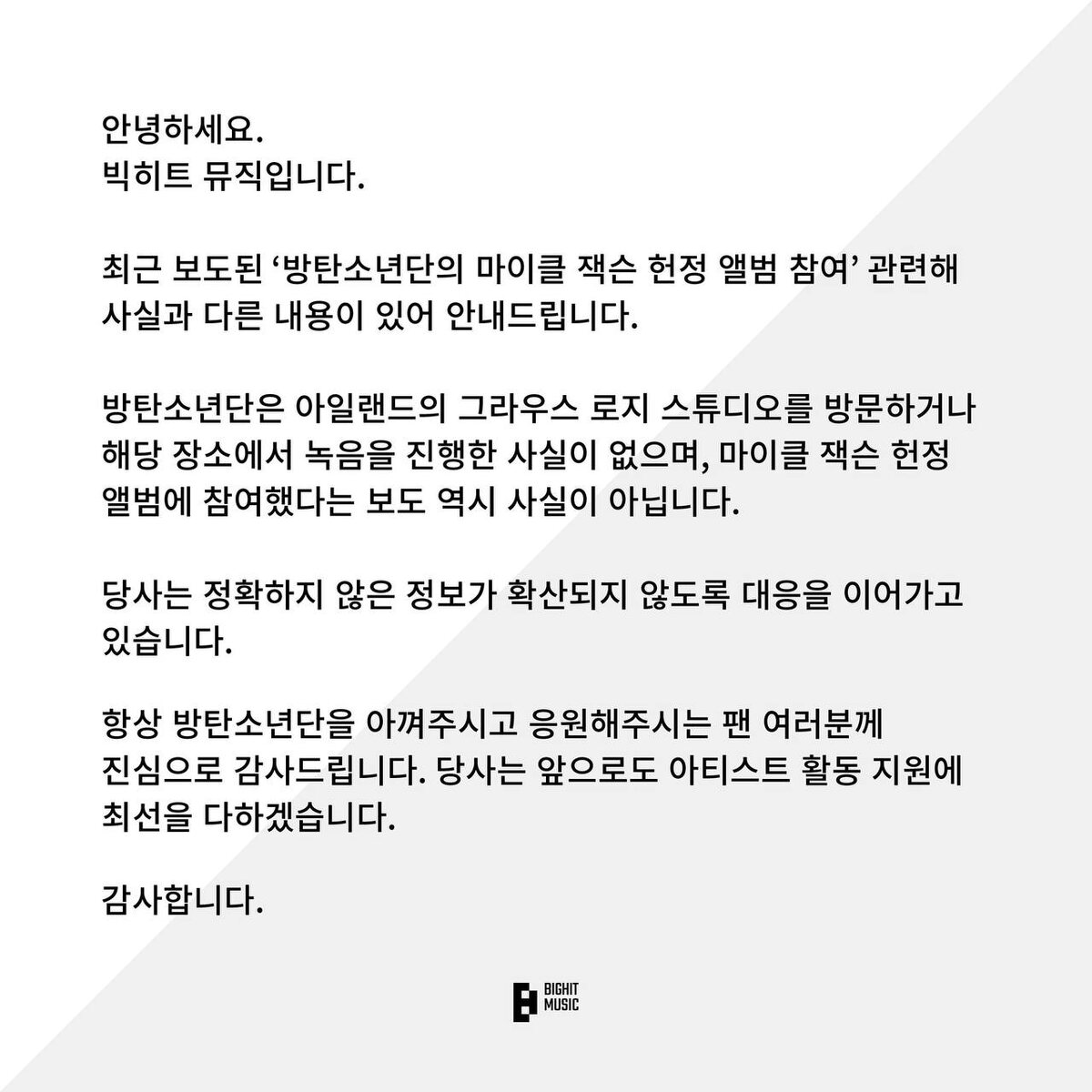🍊 Объявление касательно "Участия BTS в трибьют-альбоме Майклу Джексону": Здравствуйте, Это BigHit Music. Мы хотели бы отреагировать на недавние сообщения СМИ, касающиеся предполагаемого участия BTS в трибьют-альбоме Майклу Джексону. BTS не посещали студию Grouse Lodge в Ирландии и не принимали участие в каких-либо сессиях звукозаписи в этом месте для упомянутого проекта. Группа не участвует в трибьют-альбоме ни в каком качестве. Мы продолжаем принимать соответствующие меры для предотвращения распространения неточной информации. Мы выражаем нашу искреннюю благодарность фанатам за постоянную поддержку BTS. Мы по-прежнему полностью привержены поддержке артистов и их начинаний. Спасибо. #BTS @kumihobts