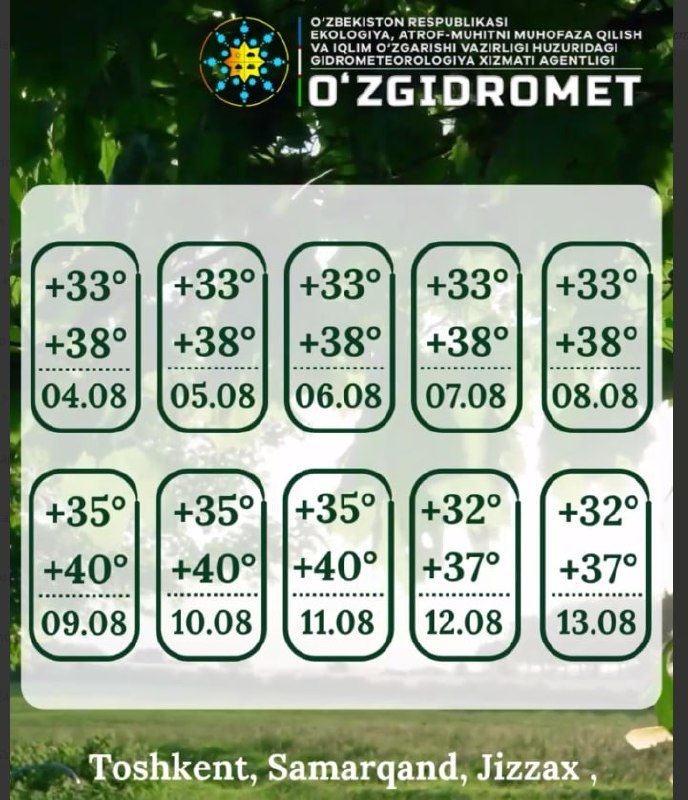 Ўзбекистонга яна аномал иссиқлик қайтмоқда, +45 даража дим ва иссиқ бизни кутмоқда «Ўзгидромет» маълумотига кўра, мамлакатимизда 6 августдан яна қаттиқ иссиқлик бошланади. Бундай иссиқлик саломатликка жиддий таъсир қилиши мумкин. Шунинг учун мутахассислар соат 11:00 дан 17:00 гача тўғридан-тўғри қуёш нуридан сақланиш ва кўпроқ сув ичишни тавсия этмоқда. Каналимизга обуна бўлинг ва энг сўнгги янгиликларни кузатиб боринг Jizzaxnews |Тelegram | Facebook | Dzen | YouTubе