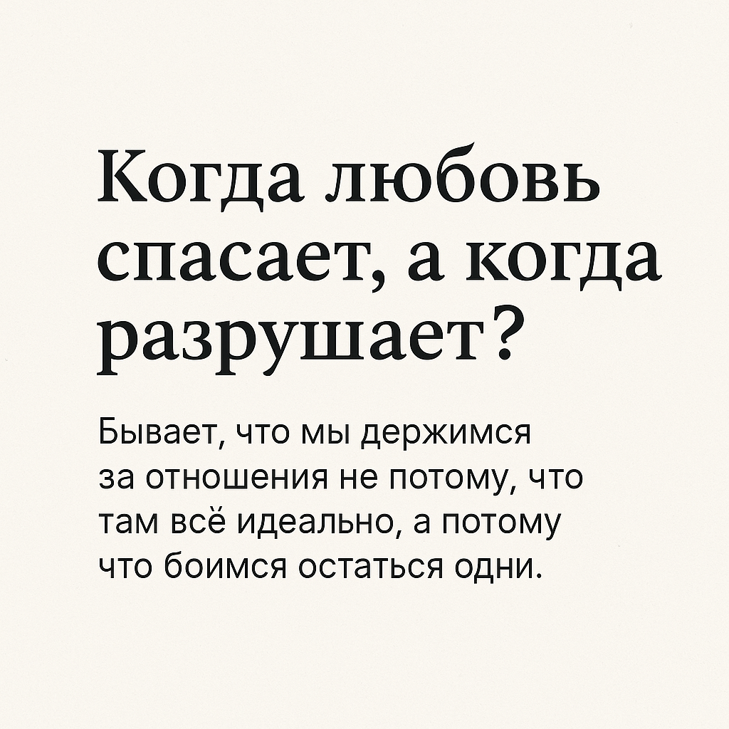 Бывает, что мы держимся за отношения не потому, что там всё идеально, а потому что боимся остаться одни. Страх одиночества — один из самых сильных человеческих страхов. Но иногда он играет с нами злую шутку: мы готовы терпеть то, что нас ранит, лишь бы не потерять хоть какую-то близость. Я сама не раз замечала за собой: цепляюсь за человека, даже если понимаю, что мне плохо. Думаю, а вдруг больше никто не полюбит? А вдруг я не справлюсь одна? Эти мысли могут съедать изнутри. Но если честно, любить — это не значит мучиться. Любовь должна делать нас сильнее, а не разрушать. В отношениях всегда будут трудности, это нормально. Но когда ты регулярно чувствуешь себя одинокой рядом с партнёром, когда всё чаще приходится зажигать себя самой, когда твои желания и мечты не находят отклика — это тревожный звоночек. В такие моменты важно спросить себя: ✔️ Я действительно счастлива? ✔️ Чувствую ли я поддержку? ✔️ Готов ли партнёр идти навстречу, или ему всё равно? Если ответ чаще «нет», чем «д