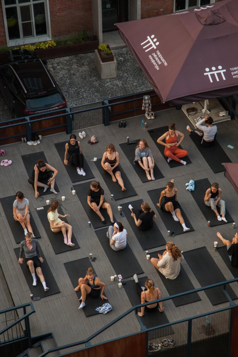 3 августа наша редакция совместно с командой HOLI YOGA провели летнее мероприятие — йогу на террасе Товарищества Рябовской Мануфактуры