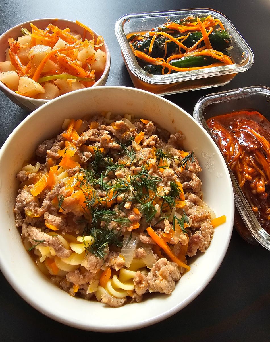 Кто сказал, что русская и корейская кухни несовместимы? Наш недавний обед доказал обратное! Классические макароны с фаршем неожиданно заиграли новыми красками в компании традиционных корейских закусок. Острое, хрустящее кактуги (кимчи из дайкона), освежающее ои собаги (кимчи из огурцов) и пикантные грибы эноки в остром соусе идеально дополнили сытное русское блюдо. Обилие овощей в корейских закусках внесло баланс и свежесть в обед, сделав его по-настоящему интересным и вкусным. Этот гастрономический эксперимент показал, что смелые сочетания могут приводить к восхитительным результатам. Рекомендуем попробовать!