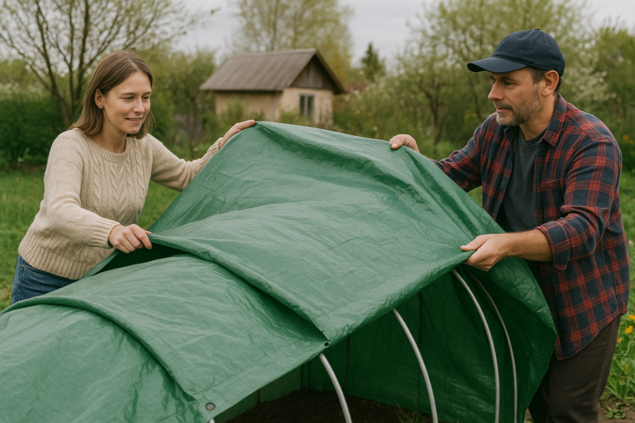 Когда лето приносит не только солнце, но и ливни, град и палящий зной, дачники и фермеры всё чаще прибегают к проверенному решению — укрывают урожай тентами. Ниже — десять простых, но настоящих историй о том, как обычные укрывные материалы спасали труд целого сезона. Наталья из Подмосковья рассказывает, как за несколько минут до ливня натянула тент на дуги над грядками с помидорами. Град был с горошину, и побил всё вокруг, но укрытые кусты остались целы. Урожай собрала без потерь. Андрей из Воронежа экспериментировал с ранней клубникой. Весной ударило +35, ягода буквально запекалась. Он сделал простую тентовую навеску на деревянной рамке, снизил температуру на грядке на 7 градусов. Сбор удалось спасти, вкус сохранился. Ольга с юга Урала устала бороться с вороной, которая методично уничтожала капусту на рассаде. Повесила полупрозрачный зелёный тент — свет проходит, но птицы не подлетают. За месяц вырастила крепкие кочаны. Семья Губаревых живёт в селе, где погода может меняться за 10 мин