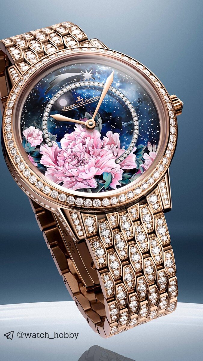 Jaeger-LeCoultre как произведение искусства: две женские лимитированные новинки. Модели получили название Rendez-Vous Jewellery Shooting Star, они обе украшены россыпью бриллиантов и невероятными циферблатами. Что с характеристиками: - Корпус из золота - Ремешок из кожи или браслет из золота - Диаметр корпуса: 36 мм - Высота корпуса: 11.16 мм - Сапфировое стекло с антибликом - Водозащита 50 метров - Автоматический механизм Jaeger-LeCoultre 734. Модель в сочетании с браслетом украшена 625 бриллиантами весом 6.31 карат, они расположились на безеле, ушках, боковых гранях, заводной головке, циферблате и браслете. Модель на кожаным ремешке скромнее - всего 189 бриллиантов суммарно 🤩 Циферблат модели на браслете украшен ярким розовым пионом, который раскрывается на фоне ночного неба, состоящего из 500 звезд. Падающая звезда то появляется, то исчезает и снова появляется в случайном месте. Циферблат модели на браслете сделан в более холодной палитре, те же пионы, но уже голубые. Цифербла