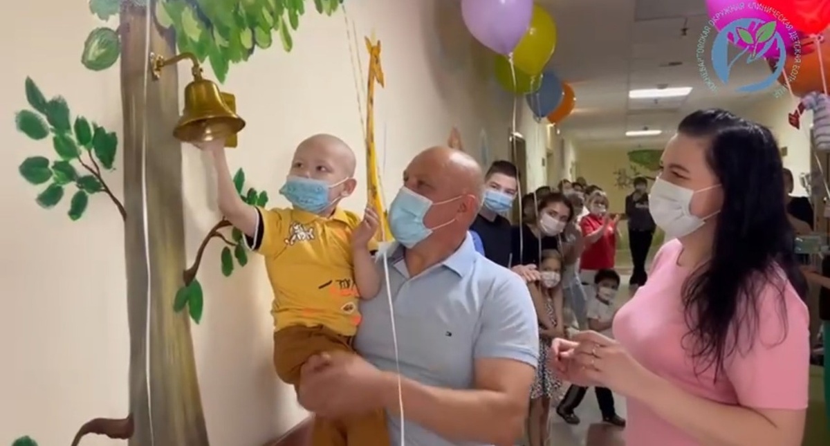 Сейчас Арсений находится в ремиссии. В день выписки из отделения он, окруженный родителями, старшими братьями, врачами, медсестрами и другими пациентами, с гордостью ударил в колокол, символизируя свою победу над онкологией.