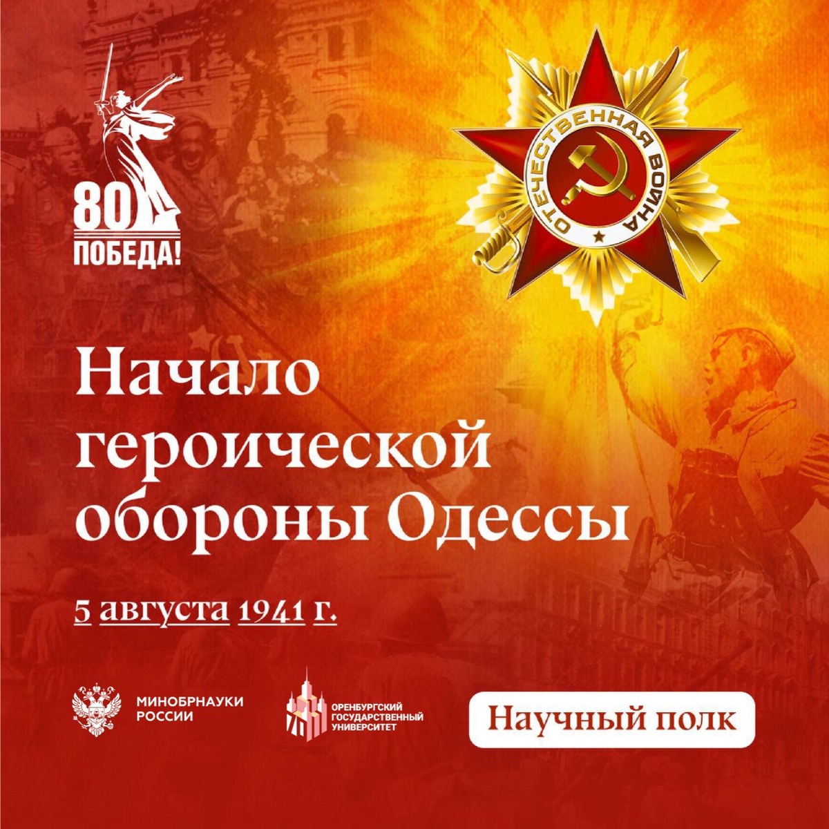 73 дня мужества ⭐️ Сегодня, 5 августа, ровно 84 года назад началась оборонительная операция войск Отдельной Приморской армии и сил Черноморского флота, нацеленная на удержание Одессы. В рамках проекта «Научный полк» мы хотим рассказать об этой странице истории Великой Отечественной войны. В начале августа 1941 года наступление немецких и румынских войск создало угрозу окружения позиций советского Южного фронта Красной армии. Было решено защищать город до последней возможности ✊ Для защиты города в короткие сроки были построены три оборонительных рубежа, на улицах возведено около 250 баррикад. Несмотря на численное превосходство, противникам не удалось быстро овладеть городом. За 73 дня сопротивления более 38 тысяч одесситов строили укрепления, медики и студенты работали в госпиталях под обстрелами, а промышленность города выпускала боеприпасы и ремонтировала технику под постоянными бомбежками. Больше малоизвестных фактов об обороне Одессы читай в наших карточках 💡 #ОГУ #в_ОГУ #O