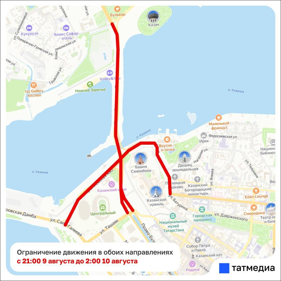 В ночь с 9 на 10 августа в центре Казани временно ограничат движение транспорта в связи с проведением легкоатлетического забега «Ночная Казань». Помимо этого, с 6 по 10 августа будет закрыта парковка у Центрального стадиона. 🌟 Tatarstan News
