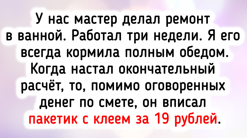 У нас мастер делал ремонт в ванной. Работал три недели. Я его всегда кормила полным обедом. Когда настал окончательный расчёт, то, помимо оговоренных денег по смете, он вписал пакетик с клеем за 19 рублей. © Л. К. / ADME