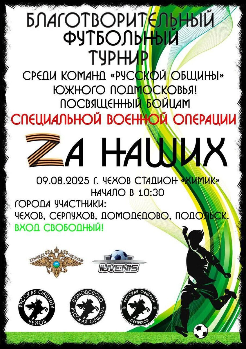 ✨ Футбольнй турнир среди команд "Русской общины" в городе Чехов ⚽ Приглашаем 🌞 Русская община из г. Серпухов также участвует 💪 🏢 Стадион "Химик" 📍 г. Чехов, за ДК "Дружба" ул. Чехова, 45 🚫 Возраст: 0+ 📆 09.08.2025 🕒 10:30 💰 Вход свободный❗️ #webСерпухов ⭐Разместить публикацию ⭐Поддержать канал голосом 💰 Стань курьером в Серпухове – твой доход, твое время! ✅ Мероприятия Серпухов https://dzen.ru/id/66f01c6eb4c6fe60c9ca1608 http://vk.com/serpukhov_events http://dzen.ru/serpukhov_events