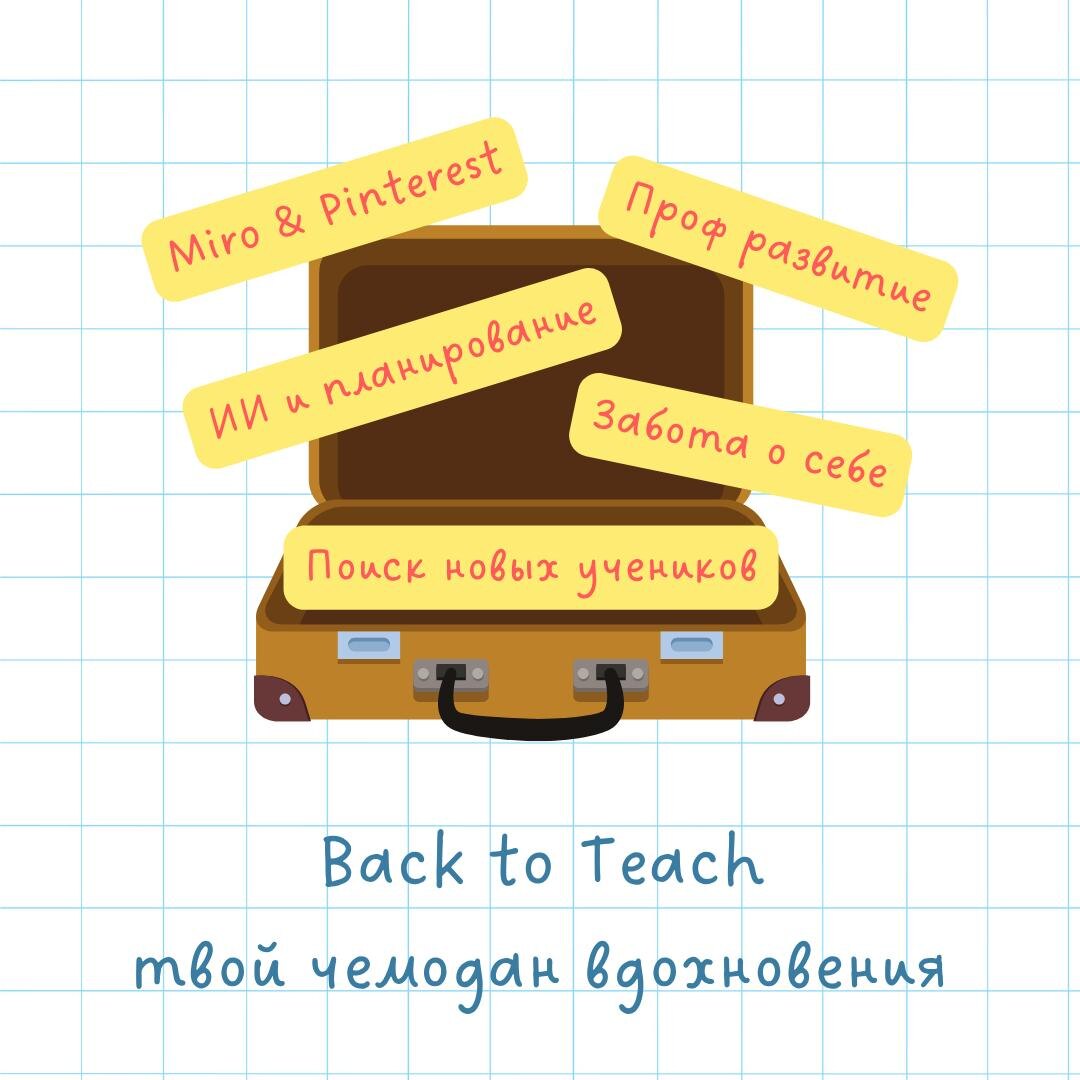 Сентябрь уже близко, а это значит, что пора готовиться к новому учебному году! Мы с коллегами решили подготовить для вас чемоданчик вдохновения на новый учебный год В нем вы найдете: 🟠промокод на экспресс-разбор Авито ⚪️консультацию по профессиональному развитию на 2025-2026 год 🟤чек-лист для подготовки тичера к учебному году 🟠промокод на скидку на курс по работе с Miro ⚪️гайд по ИИ для преподов ⚪️консультация по подготовке к международным экзаменам (IELTS, CAE, DELTA, CELTA, TKT) 🟤чек-лист "Готов ли мой Pinterest к продвижению?" 🟠промокод на скидку на курс по продвижению Pinterest Для того, чтобы получить эту пользу, скорее подписывайся на наш чемоданчик и напиши слово ЧЕМОДАН в личные сообщения @evgensazon [кликайте на чемоданчики и подписывайтесь на участников]👇 💼💼💼💼💼💼💼💼💼💼💼💼 Также мы дарим вам подборку полезных постов с каналов наших спикеров! 🖇️ChatGPT и построение плана занятий Большая подборка промптов 🧷ПЯТЬ неочевидных запросов для ChatGPT, которые мог