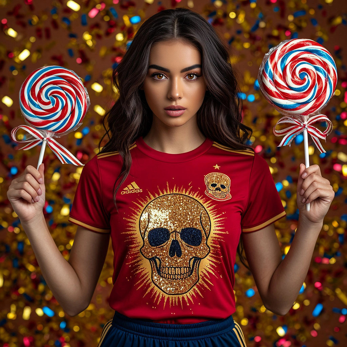 ✨ Los Spectros Dorados: Когда футбол становится магическим реализмом ✨ В мире футбола, где трибуны грохочут, как гром среди ясного неба, а зелёное поле становится сценой для вечного противостояния мечты и реальности, так мало настоящей магии. Где же те клубы, чьи формы — не просто униформа, а одеяния для священнодействия? Где цвета, что горят, как расплавленное золото в горниле андалузского заката? Мы решили восстать против этой скучной геометрии. Наш ответ — форма, которая будто явилась из сновидения, навеянного ночью под гитару фламенко и звон колокольчиков Día de los Muertos. Алый, как запретная страсть, джерси, по которому рассыпано золотое солнце-череп — оно пылает, будто отлито из самого света испанского полдня. Рядом — миниатюрный череп-амулет, чья ухмылка шепчет: «Мы все умрём, но сегодня — танцуем». Выше — звезда, трепещущая, как последняя надежда. А вместо обычного мяча — гигантские леденцы-спирали: алые (ярость), белые (чистота безумия), лазурные (цвет неба над Севильей в то