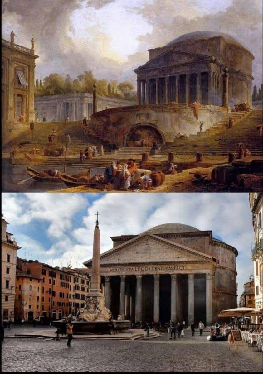 Было / Стало. Пантеон в Риме 🏛 Верхняя часть — фантазия художника XVIII века. Нижняя — фото сегодняшнего дня. Пантеон всё ещё на месте. Всё те же колонны, та же латинская надпись, всё так же купол ловит небо. Но вот площадь перед ним изменилась. Где были лодки и вода — теперь брусчатка и туристы с кофе. Обелиск — всё тот же, но сегодня к нему ближе можно подойти только с телефоном в руках. Прошло почти две тысячи лет, а Пантеон всё так же держит линию горизонта. Он видел падение империй, смену религий и шум человеческих эпох. И каждый раз оставался стоять. 👉 А вы бы выбрали Рим тогда… или Рим сейчас?