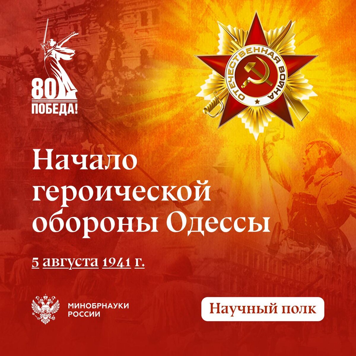 #НаучныйПолк В год 80-летия Победы мы продолжаем вспоминать ключевые даты в ходе Великой Отечественной войны. Следующая статья посвящена началу героической обороны Одессы. 5 августа 1941 г. началась героическая оборона Одессы. Операция длилась 73 дня и завершилась 16 октября 1941 года. Ход битвы Южный фронт Красной Армии оказался самым подготовленным к ведению боевых действий, и с началом Великой Отечественной войны успешно отражал все удары немецких и румынских войск. В конце июля — начале августа Южному фронту из-за угрозы окружения, вызванной неудачными действиями советских войск Юго-Западного фронта, пришлось отступать на восток и создать оборонительный рубеж по линии Чигирин - Вознесенск – Днестровский лиман. 19 августа Ставка Верховного Главнокомандования создала Одесский оборонительный район (OOP), подчиненный военному совету Черноморского флота. Командующим ООР был назначен контр-адмирал Гавриил Васильевич Жуков, его заместителем по сухопутной обороне стал генерал-лейтенант Г.