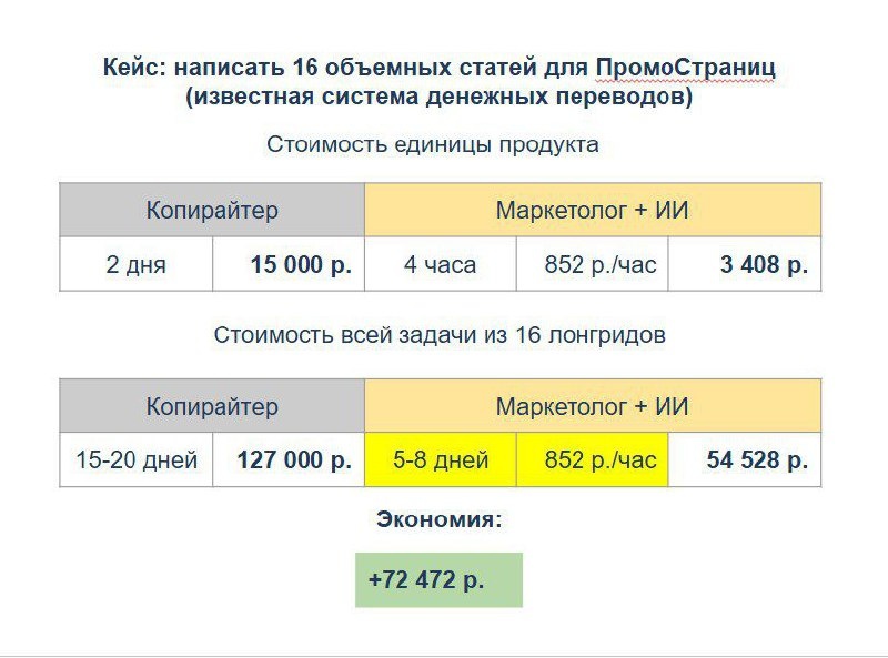 Кейс: как мы в агентстве зарабатываем с помощью ИИ? Сейчас каждый первый маркетолог рассказывает про свой опыт взаимодействия с ИИ, делится крутыми промтами и показывает что получилось. В большинстве случаев получаются действительно достойные вещи: необычные креативы, тексты в стиле Лавкрафта, классные видео или музыка. Но мало кто из коллег делится цифрами, насколько внедрение той или иной крутой фичи повлияло на деньги. Пойду другим путем и расскажу наш кейс. Простой, понятный, с цифрами. Итак. Однажды нам нужно было срочно запустить очередной рекламный флайт в Промостраницах Яндекс для одного из наших дорогих клиентов. Необходимо было оперативно написать 16 текстов по определенной логике с целью: заинтересовать аудиторию, увлечь статьей и в конце органично подсказать, что в данной ситуации можно воспользоваться клиентским продуктом. У меня нет штатного копирайтера, есть только проверенный подрядчик, который пишет классные вдумчивые и продающие тексты под заказ. Мы пошли за оценк