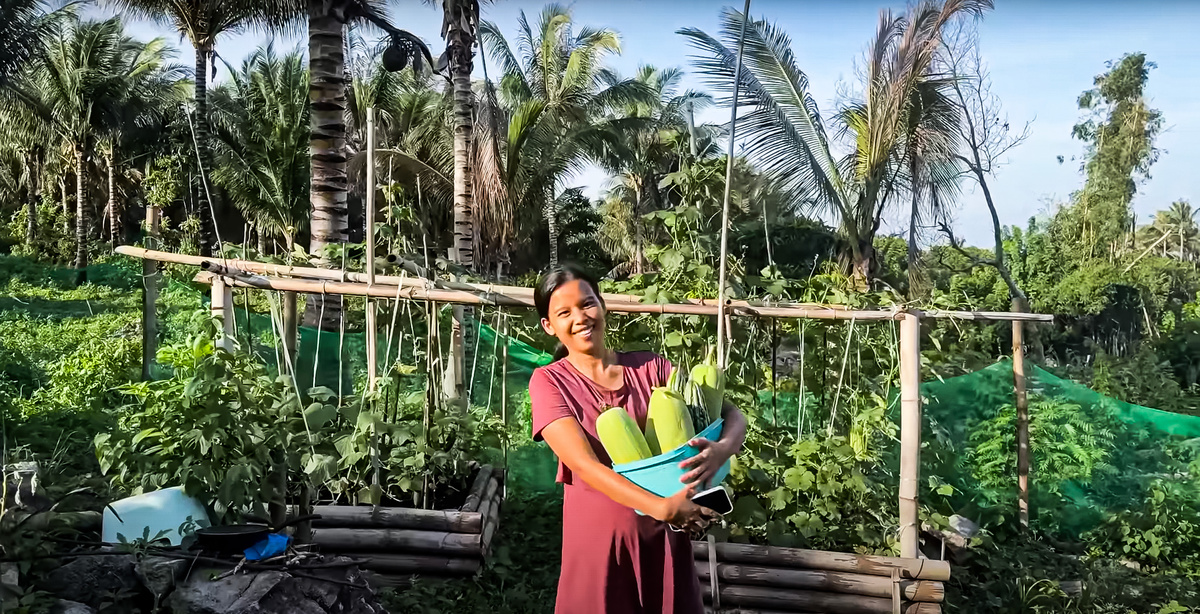 У Найви начали поспевать первые настоящие огурцы. Не шучу — она за ними следит почти по часам. Они буквально на глазах увеличиваются. На Филиппинах вообще любят всё выращивать до гигантских размеров. Вот только беда в том, что часто эти гиганты — не самые вкусные. Особенно огурцы: стоит им чуть перерасти — и уже как трава, без вкуса.