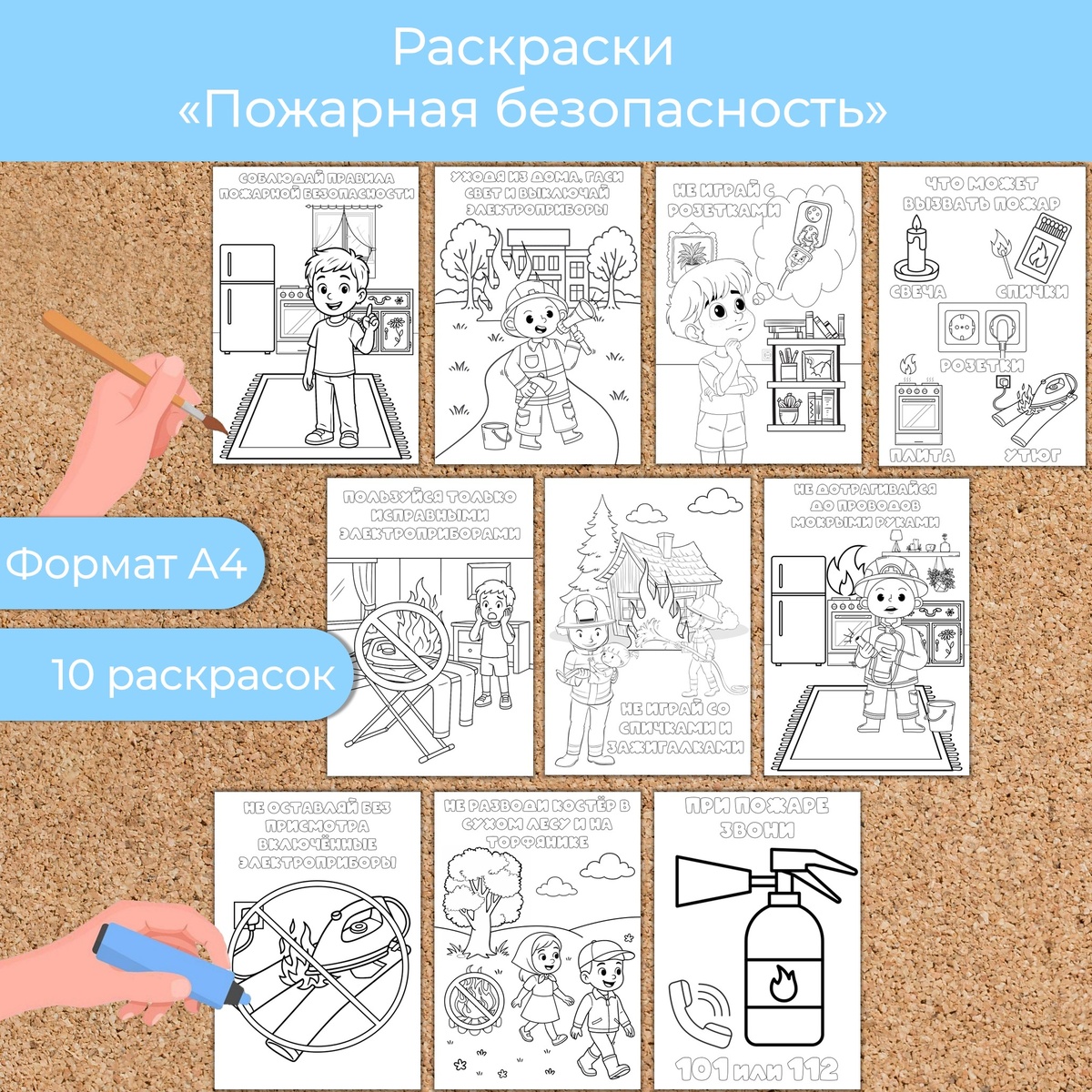 Раскраски на тему «Пожарная безопасность». Данный материал можно использовать как дополнительный инструмент на тематических занятиях, посвящённых правилам пожарной безопасности, профилактике возникновения пожаров и действиям в случае возникновения чрезвычайных ситуаций. Раскраска помогает в концентрации внимания, развивает творческие способности, улучшает мелкую моторику и координацию движений. В наборе 10 раскрасок с различными сюжетами по теме. На каждой раскраске расположено правило пожарной безопасности, что помогает детям лучше запомнить и понять важные меры предосторожности. Можно раскрасить с помощью красок, цветных карандашей или фломастеров. Файл в формате PDF на листах А4. В процессе печати можно настроить необходимый размер материалов (например, сделать раскраску на листах А5). Подходит для черно-белой печати.