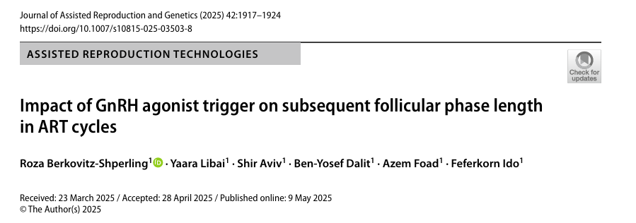 Дизайн исследования: ретроспективное когортное исследование, 196 женщин, проходящих контролируемую стимуляцию яичников с тотальной криоконсервацией эмбрионов с целью ПГТ-М; 132 пациентки получали триггер агонист ГнРГ, а 64 - триггер ХГЧ. Протокол стимуляции: с антагонистами дозы 150-300 МЕ (р ФСГ, рФСГ+ЛГ, ЧМГ) триггеры: трипторелин 0,2 мг, при созревании более 15 фолликулов, диаметром более 12 мм либо рХГЧ (овитрель 250 мг) Результаты в группе агонистов ГнРГ фолликулярная фаза была значительно более продолжительной по сравнению с группой, получавшей ХГЧ (18,98 ± 3,54 против 16,06 ± 3,13 дней, Р < 0,001), при этом удлиненная фолликулярная фаза наблюдалась в 90,2% циклов по сравнению с 60,9% циклов(P < 0,001). прием агониста ГнРГсвязан с удлинением последующей фолликулярной фазы, с увеличением продолжительности на 5,33 ± 3,83 дня по сравнению с естественными циклами пациентов (Р < 0,001). Количество антральных фолликулов в обеих группах было сопоставимым (14,52 ± 7,71 против 1